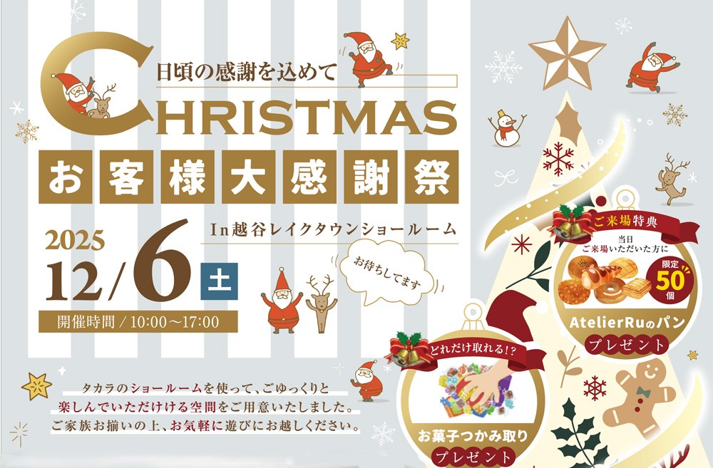 日頃の感謝を込めた「お客様大感謝祭」が、2025年12月に越谷レイクタウンショールームで開催されます。