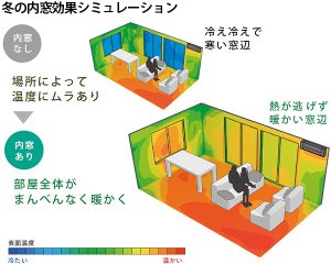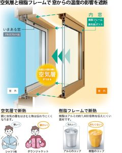 内窓をプラスすることで、窓と窓の間に空気の層ができ、外気の影響を大幅にカット。冬は暖房の熱を逃がさず、夏は外からの熱気を遮断します。