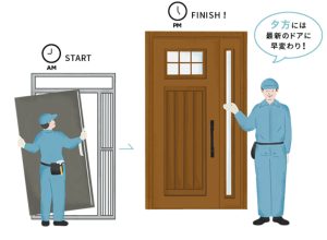 ドアリモは、既存のドア枠の上に新しい枠をかぶせて取り付ける「カバー工法」です。壁を壊さずに施工できるため、大掛かりな工事が不要で、騒音やホコリも抑えられます。通常、わずか1日で工事が完了するため、生活への影響を最小限にしつつ玄関を新しく生まれ変わらせられます。 -